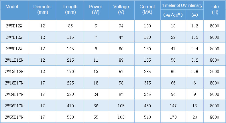 Hot cathode, preheat start. The electrode and quartz glass tube are specially treated to ensure the long life tube of the lamp without early blackening. The maintenance rate of ultraviolet light intensity can reach more than 80% of the initial value. Ultraviolet radiation intensity, 10cm 1833um/ C square meters.